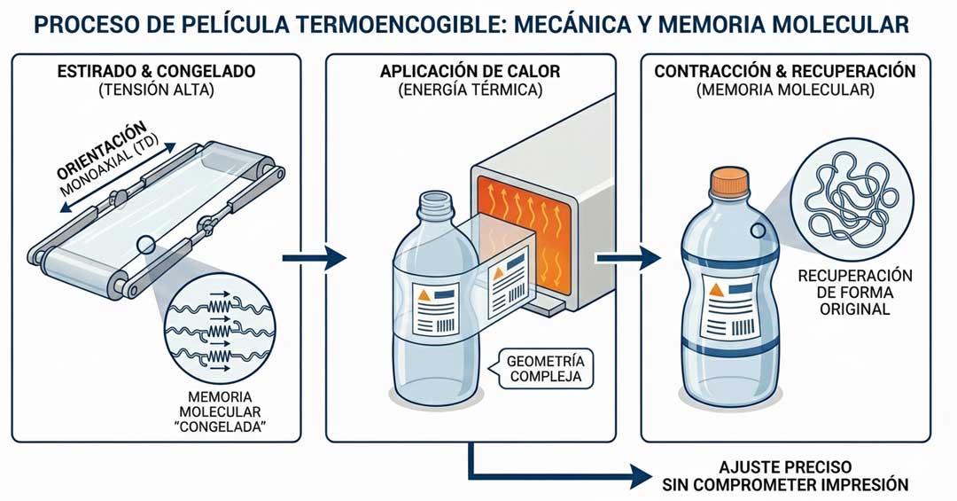 Durante la extrusión, el proceso estira y “congela” el film en un estado de alta tensión. Cuando el convertidor lo procesa y lo aplica, el calor libera esa tensión interna, lo que produce una contracción controlada sin comprometer la integridad de la impresión.